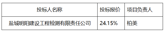 招标人:江苏海瀛资产管理有限公司 项目名称:环科城派出所7号楼工程检测服务 评标方法:合理低价法 最高限价:50% 中标候选人:盐城明阳建设工程检测有限责任公司